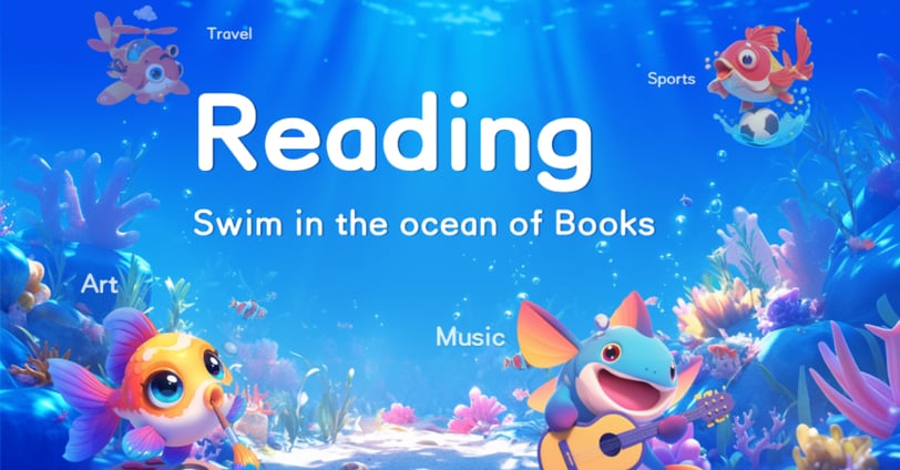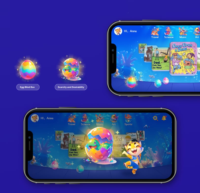 Swim in the sea of knowledge. Combined with the IP characters to start the reading journey, so that users have a more complete experience of reading. In order to better connect the story with the switch of fun interactive questions and reduce the sense of disconnection, the interface level follows the scenes, elements, colors and characters in the story for fun design, making the visual more coherent and the experience more immersive.